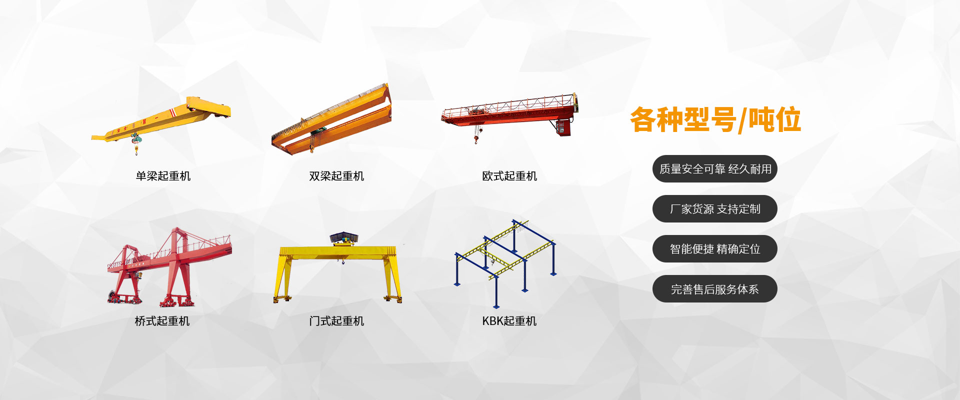 單梁起重機 升降貨梯 雙梁起重機 歐式起重機 門式起重機 橋式起重機 KBK起重機 懸臂起重機 防爆起重機 電動葫蘆 龍門吊 柔性吊